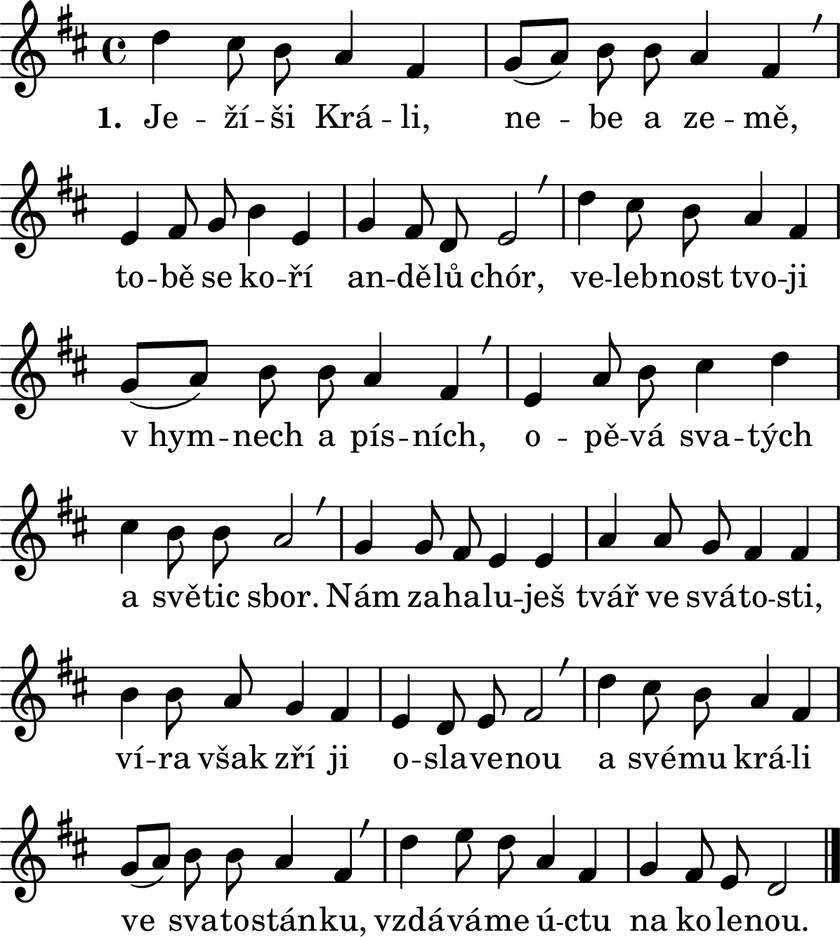 X:42 Q:100 T: M:C L:1/8 K:D d2 c B A2 F2|(G A) B B A2 F2|z| w:1.~Je- ží- ši Krá- li,|ne- ~ be a ze- mě,| E2 F G B2 E2|G2 F D E4|z|d2 c B A2 F2| w:to- bě se ko- ří|an- dě- lů chór,|ve- leb- nost tvo- ji| (G A) B B A2 F2|z|E2 A B c2 d2| w:v~hym- ~ nech a pís- ních,|o- pě- vá sva- tých| c2 B B A4|z|G2 G F E2 E2|A2 A G F2 F2| w:a svě- tic sbor.|Nám za- ha- lu- ješ tvář ve svá- to- sti,| B2 B A G2 F2|E2 D E F4|z|d2 c B A2 F2| w:ví- ra však zří ji o- sla- ve- nou|a své- mu krá- li| (G A) B B A2 F2|z|d2 e d A2 F2|G2 F E D4|] w:ve ~ sva- to- stán- ku,|vzdá- vá- me ú- ctu na ko- le- nou.|