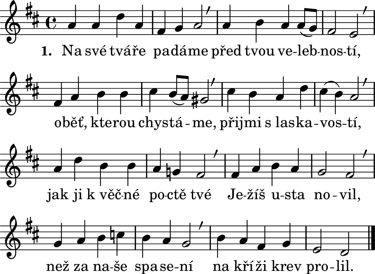 1. Na své tváře padáme / před tvou velebností, / oběť, kterou chystáme, / přijmi s laskavostí, / jak ji k věčné poctě tvé / Ježíš ustanovil, / než za naše spasení / na kříži krev prolil.