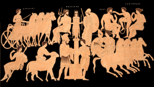 Řeka zahučela jako bouře a z rozbouřených vln vyrazili s řehtáním okřídlení koně a od kopyt jim sršely jiskry. Za sebou táhli lehký vůz, třpytící se jako pěna na vrcholcích vln. Pelops žasl, děkoval Poseidonovi a slíbil mu bohatou oběť.