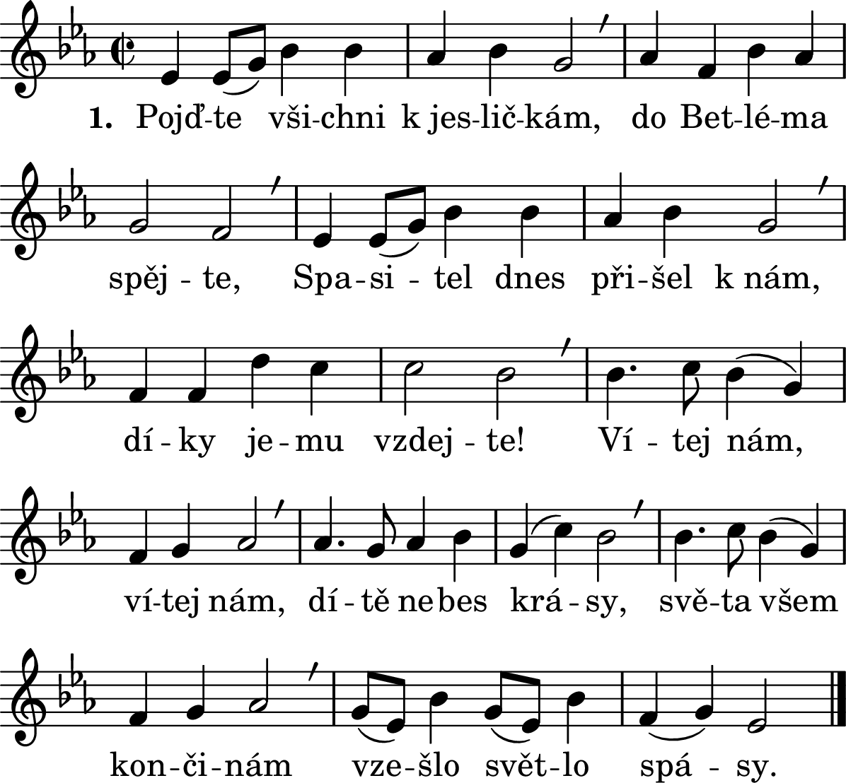 1. Pojďte všichni k jesličkám, / do Betléma spějte, / Spasitel dnes přišel k nám / díky jemu vzdejte! / Vítej nám, vítej nám, / dítě nebes krásy, / světa všem končinám / vzešlo světlo spásy.